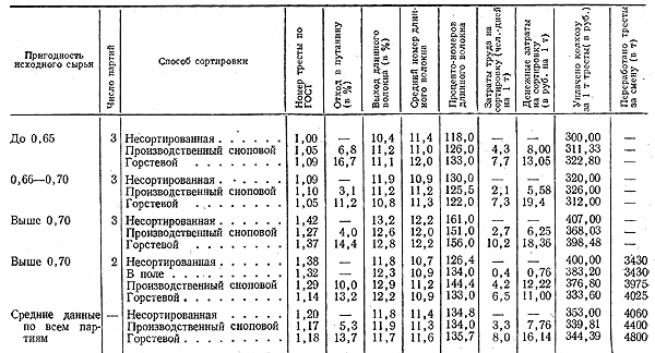 Однако многолетние опытные данные ВНИИЛ показывают (табл. 109), что требования ГОСТ 2975—57 по тщательной подготовке и сортировке тресты не совсем обоснованы и они в основном необходимы для более правильного определения ее качества при органолепти-ческой оценке. Сортировка тресты не дает технологической и экономической эффективности, так как при ее проведении 5—12% стеблей отходит в путанину, которая оценивается № 0,50, а при механической обработке перерабатывается на короткое волокно. Кроме того, сортировка требует больших затрат ручного труда, что вызывает большие денежные расходы. В условиях острого недостатка рабочей силы в льноводных хозяйствах сортировка тресты затягивает сроки реализации ее и вызывает дополнительные потери.