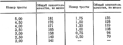 Номер тресты устанавливают на основании отдельных показателей качества, которые находят по таблице, имеющейся в ГОСТ. Все показатели суммируют и по значению общего показателя качества находят номер тресты (табл. 114).