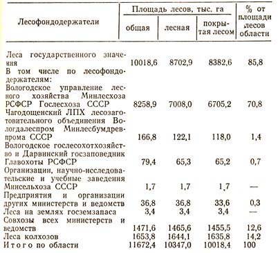 На долю лесов государственного значения, находящихся в ведении Вологодского управления лесного хозяйства Минлесхоза РСФСР, приходится 8258,9 тыс. га, или 70,8% лесного фонда области; на леса, закрепленные за другими министерствами и ведомствами, – 1759.7 тыс. га, или 15,0%; на долю колхозных лесов – 1653.8 тыс. га, или 14,2%. Покрытая лесом площадь составляет 10018,4 тыс. га, т. е. 85,8% общей площади лесов, или 96,8% всей лесной площади области. Несомкнувшиеся лесные культуры и не покрытая лесом площадь (вырубки, гари, редины и прогалины) составляют 328,6 тыс. га, или всего 3,2% лесной площади. Средняя лесистость территории области, по данным лесоустройства 1971 – 1979 гг., составляет 69%.