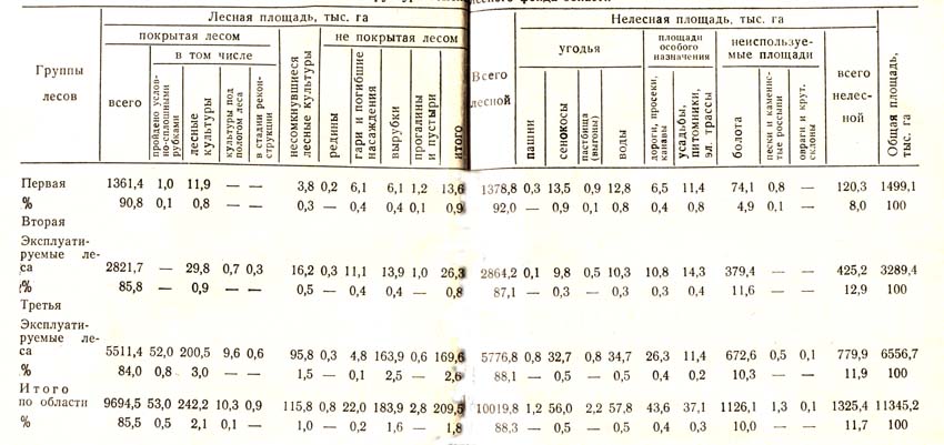 Из таблицы видно, что основная часть площади лесов области отнесена к лесам третьей группы, которые имеют преимущественно эксплуатационное значение и предназначены для непрерывного удовлетворения потребностей народного хозяйства в древесине.