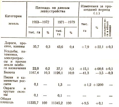 Нелесная площадь представлена в основном болота-Ми (85,0%) и водоемами (4,4% нелесной площади). Особенно много их на западе и юго-западе области. Объясняется это в значительной мере тем, что из этих районов позднее ушел ледник. Многие болота образовались в результате зарастания послеледниковых водоемов. Остальную часть нелесной площади составляют в основном угодья и площади спецхозназначения. Распределение нелесной площади по категориям земель в пределах групп лесов имеет незначительное отклонение от распределения их в целом по области.