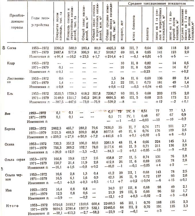 Изменения других средних таксационных показателей отражают естественный ход роста и поспевания насаждений, процессы рубки древостоев, восстановление леса на вырубках и прочие изменения в лесном фонде.