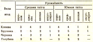Для выявления периодичности урожаев ягод нами использованы фенологические наблюдения за многолетний период (более 10 лет): для средней подзоны тайги – данные Северной краевой комиссии (1935), г. Вельска Архангельской обл. (1933 – 1973), с. Корткеросс Коми АССР (1936 – 1976); для южной подзоны тайги – данные Дарвинского госзаповедника (1947 – 1969), ст. Нерехта Костромской обл. – за 50 лет и г. Никольска Вологодской обл. за 1932 – 1969 гг. По данным этих многолетних наблюдений составлена таблица повторяемости урожаев ягод разной интенсивности в среднем за 10 лет (табл. 27).