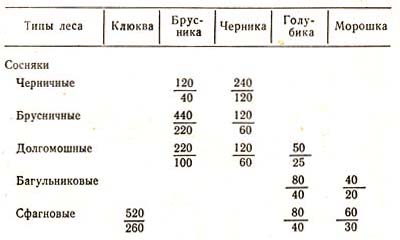 По нормативам среднегодовой урожайности ягод и структуре лесного фонда области по типам леса нами произведен расчет среднегодовой промысловой урожайности ягод в лесах упрлесхоза Вологодской области (Е. Г. Тюрин, Н.Л. Шишкин, 1975). Общий промысловый урожай составляет 67,0 тыс. тонн, в том числе клюквы – 48,1, брусники – 4,0, черники – 13,9, голубики – 0,4, морошки – 0,6 тыс. тонн. Среднегодовая заготовка ягод всеми организациями составляет только 800 тонн, или 1,2% возможного промыслового урожая.