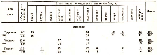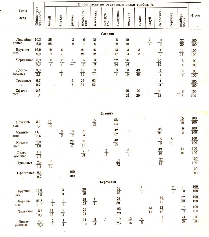 Большинство опубликованных материалов относится к определению урожайности грибов на отдельных участках территории при помощи пробных площадей, часто менее 0,10 га, или маршрутных наблюдений в течение одного-двух вегетационных сезонов. Материалов же по определению урожайности грибов и их распространению в разрезе типов леса опубликовано мало (Северная краевая плановая комиссия, 1935, В. И. Шубкин, 1969 и др.). Кроме того, значительное количество исследований и рекомендованных методик по учету грибов не увязаны с технологией и особенностями лесоустроительных работ, а также не используют типы леса, применяемые северным лесоустройством. Северное предприятие Леспроект в 1968-1970 гг. выполнило опытную работу по определению среднегодовых запасов грибов в различных лесорастительных условиях Вологодской, Архангельской областей и Коми АССР, для чего в 23 лесхозах разных подзон тайги этого региона было заложено 403 стационарных пробных площади, из которых 198 – в сосновых типах леса, 56 – в еловых, 119 – в березовых и 30 – в осиновых.