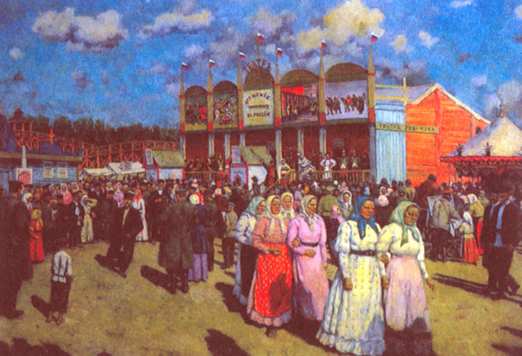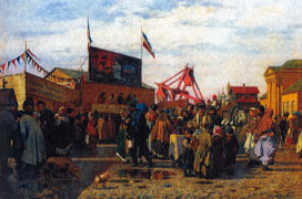 В больших деревнях развлечений в престольный праздник было больше. Центром гулянья и веселья здесь была ярмарка. Она шла все праздничные дни и собирала множество народу из окрестных и дальних деревень. Вся площадь около церкви, где обычно располагалась торговля, была заставлена палатками и просто телегами, с которых продавали баранки и бублики, колбасы, сыры, мясо, мед, дешевые лакомства, домашнюю утварь. Яркие вывески, разноцветные флажки, воздушные шары, выкрики продавцов, балаганных зазывал, песни, частушки, звуки шарманки, гармони, смех – все это создавало атмосферу радости.