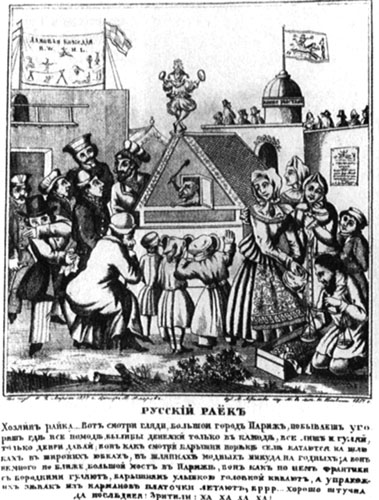 Непременной составляющей ярмарочных развлечений было и разглядывание картинок райка. Раек представлял собой небольшой деревянный ящик, в который вставлялась длинная бумажная лента с нанесенными на нее лубочными картинками. Картинки можно было увидеть через окошечки с увеличительными стеклами. Раешник кричал на всю ярмарку: «Покалякать здесь со мной подходи, народ честной: и парни, и девицы, и молодцы, и молодицы, и купцы и купчихи, и дьяки и дьячихи, и крысы приказные, и гуляки праздные, покажу вам всякие картинки – и господ, и мужиков в овчинке, а вы прибаутки да разные шутки с вниманием слушайте, яблоки кушайте, орехи грызите, картинки смотрите да карманы свои берегите». Просмотр картинок стоил дешево – «2 копейки с рыла». Медленно перематывая ленту с одного валика на другой, раешник остроумно комментировал содержание картинок: «Посмотрите, поглядите, вот большой город Париж, в него въедешь – угоришь, большая в нем колонна, куда поставили Наполеона, в двенадцатом году наши солдатики были в ходу, на Париж идти уладились, а французы взбадаражились» (Там же. С. 130).