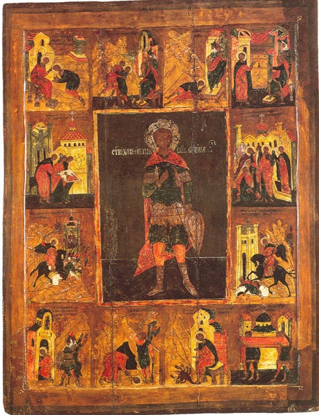 Порядок клейм: 1. Рождество св. Николая; 2. Св. Николай не принимает молока от груди матери по пятницам; 3. Крещение св. Николая; 4. Приведение во учение; 5. Поставление в диаконы; 6. Поставление в иереи; 7. Явление св. Николая царю Константину во сне; 8. Избавление от казни трех мужей; 9. Спасение Димитрия со дна моря; 10. Изгнание бесов из кладезя; 11. Чудо о Василии сыне Агрикове; 12. Чудо о ковре; 13. Преставление св. Николая; 14. Перенесение мощей св. Николая из Мир Ликийских в Барград.