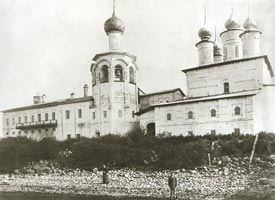 В лучшие годы даже стихийные бедствия, казалось, служили его усилению и украшению: после пожара 1472 года, уничтожившего все деревянные монастырские постройки, ростовскими мастерами здесь был воздвигнут, как говорилось выше, великолепный первенец северной каменной архитектуры Спасо-Преображенский собор, массивный, изукрашенный декоративными поясами куб которого увенчивался горкой кокошников и двумя главами