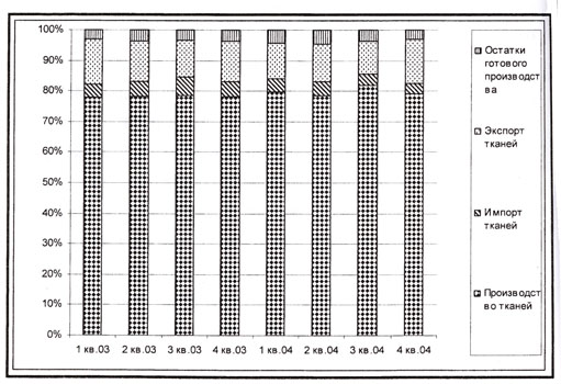Начиная с марта 2004 года, темпы роста производства легкой и текстильной промышленности пошли на спад, рост в июне общей грустной картины не меняет, т.к. в июле – спад, а в августе-сентябре – рост, в октябре-декабре – спад, нестабильность в текстильной промышленности стала нормой.