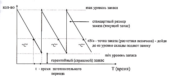 Запасы подразделяются на текущие и страховые (рис. 1). Время заготовительного периода «t» равно времени, затрачиваемому для производственного потребления запаса «С» от точки заказа «N» до минимального уровня. Кроме форс-мажорных обстоятельств за минимальный уровень, то есть на уровень использования страхового запаса в производственном потреблении, заходить нельзя. Превышение максимального уровня возможно только в случае предстоящего повышения цен или дефицитности данного товара. Уровень страхового запаса обычно определяется для каждой товарной позиции отдельно, и, как правило, является процентным соотношением к количеству единиц, потребляемых в течение заготовительного периода. По существу страховой запас представляет собой просто разность между потреблением в течение заготовительного периода и точкой заказа. Чем выше точка заказа, тем выше уровень страхового запаса.