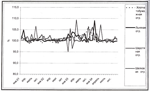 В 2003 году была отмечена нестабильность темпов роста цен производителей во всех отраслях текстильной промышленности, что объясняется зависимостью как от импорта сырья, так и сбыта готовой продукции. В 2004 году ситуация не изменилась. В июле-августе 2004 года цены производителей хлопчатобумажной отрасли снижаются, в сентябре во всех отраслях отмечается рост, а в октябре-декабре с учетом сезонного показателя цены стабилизируются (рис. 2).