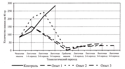 Основные потери льняного компонента происходят уже на первых этапах переработки волокнистых смесей: в процессах рыхления, трепания, чесания (табл.1). Поэтому в ходе работы были составлены такие технологические цепочки оборудования для переработки льносодержащих смесей, в которых было предусмотрено раздельное трепание и чесание волокон хлопка и смеси льна с химическими волокнами. Это имело целью создание оптимальных условий разрыхления, трепания и чесания, как для хлопка, так и для других компонентов смеси – котонина, вискозного и ПЭ волокон. В результате удалось обеспечить более высокую степень интенсивности воздействия рабочих органов на волокна хлопка и снизить ее для полиэфирнольняной и льновискозной смесей, а также уменьшить потери котонина вследствие его меньшего разрушения.
