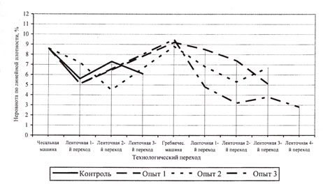 г) Полностью распрямить волокна. Процесс гребнечесания, к сожалению, создает неровноту ленты по номеру, поэтому после его применения необходимо несколько переходов ленточных машин. На них происходит выравнивание ленты и почти не образуются пороки (они удалены в процессе гребнечесания). В итоге в ленте перед ровничной машиной получается в 10 раз меньше волокнистых пороков и существенно меньше коротких волокон и в то же время неровнота по линейной плотности гребенной ленты даже ниже, чем без гребнечесания (рис. 2 и 3).