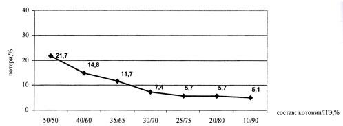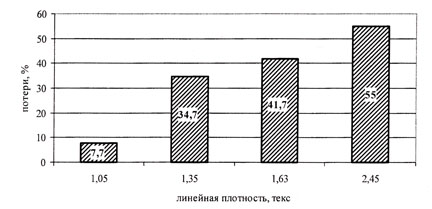 Из рис. 1а очевидно, что существенное влияние на потери котонина оказывает его линейная плотность: потери волокна тем выше, чем оно толще и чем выше процент его вложения. Рисунок 16 подтверждает нецелесообразность вложения в смесь более чем 30% котонина.
