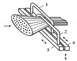Эксперименты по исследованию изнашивания нитепроводников проводились по схеме, когда продольно движущаяся пряжа огибала нитепроводник, совершающий возвратно-поступательное движение в направлении, перпендикулярном направлению продольного движения пряжи (рис. 1). В экспериментах на поверхности трения возникал износ в двух видах. Наиболее опасным с точки зрения влияния на обрывность является износ в виде канавок, т.к. пряжа может застревать в канавках. Износ в виде истирания нитеконтактирующей поверхности без существенного изменения ее формы влияет на износ нити, так как изменяет микрогеометрию нитеконтактирующей поверхности.