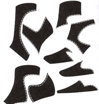 В качестве примера представлена база элементов для создания эскизов женской обуви осенне-весеннего периода носки. На рисунке 1 показана база колодок, состоящая из колодок с высокой, средней и низкой приподнятостью пяточной части и широкой, средней и узкой формой носочной части. Рисунок 2 иллюстрирует несколько деталей верха из базы деталей верха, разработанных для разных типов колодок. Элементы базы деталей низа представлены на рисунке 3.