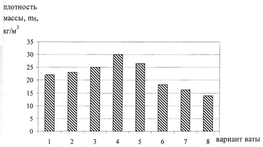 Рис. 2 – Сравнительный анализ плотности массы полученной ваты с нормами для хлопчатобумажной ваты: 1 – х/б одежная «Люкс»; 2 – х/б одежная «Прима»; 3 – х/б одежная «Швейная»; 4 – х/б мебельная; 5 – чистольняная; 6 – льносодержащая (25% ПЭ + 75% МЛВ); 7 – льносодержащая (35% ПЭ + 65% МЛВ); 8 -льносодержащая (50% ПЭ + 50% МЛВ)