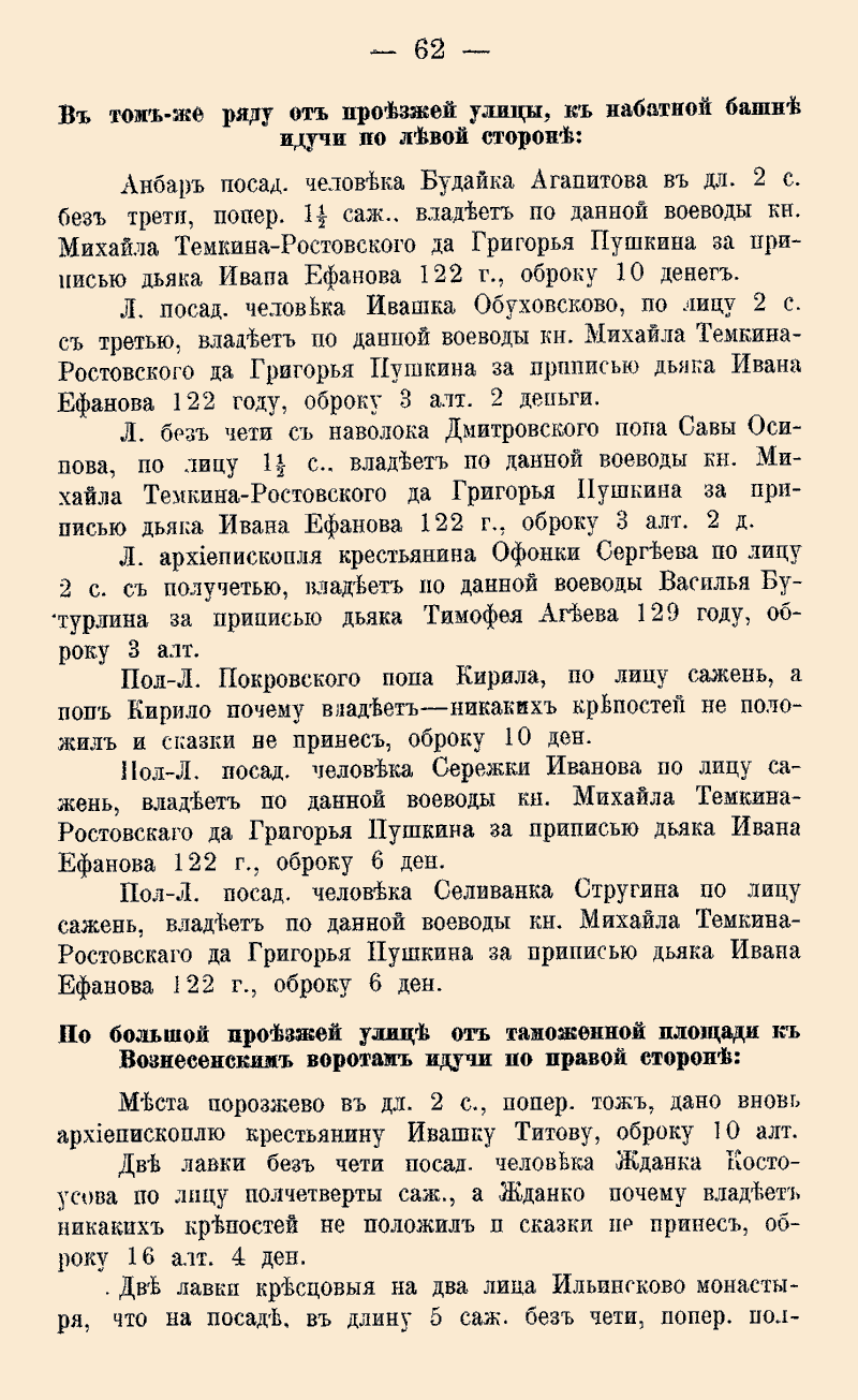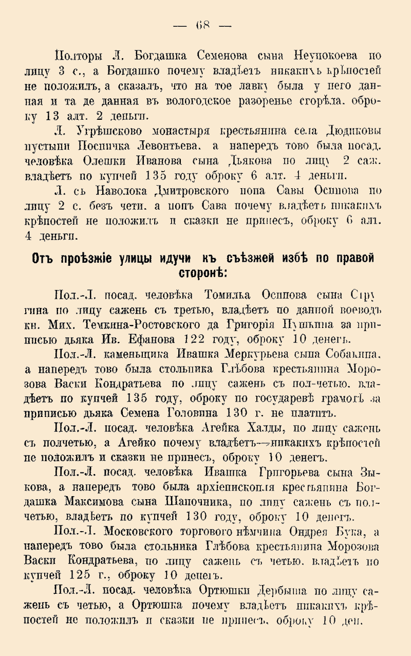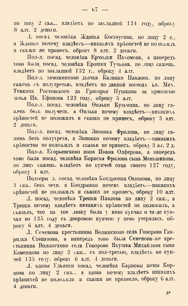 по лицу сажень, владеет по закладной 135 г., оброку 2