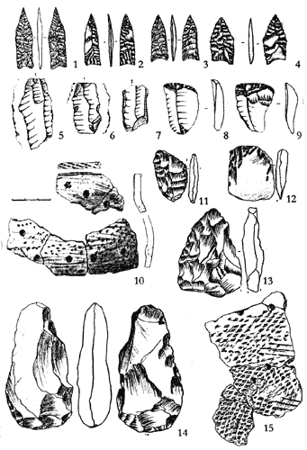 Еще меньше знаем мы о населении, сменившем волосовские племена в середине II тысячелетия до н. э. Отдельные находки керамики и каменных орудий свидетельствуют о существовании в бронзовом веке поселений на берегах Кубены. На двух многослойных поселениях — Машковские Горы и Боровиково — вместе с кремневыми орудиями, среди которых особо выделяются изящные наконечники с удлиненными боевыми концами (рис. 11: 1—4), были найдены развалы сосудов так называемой ранней сетчатой керамики, характерной для эпохи бронзы. Это тонкостенные горшки с S-видным профилем и неровной, как бы подернутой рябью, внешней поверхностью (рис. 11: 10, 15). Их называют сетчатыми. Комплекс эпохи бронзы без инокультурных примесей был обнаружен при раскопках поселения Машковские Горы (культурный слой бронзового века здесь отделен прослойкой земли без находок от более древних неолитических напластований. Среди находок — обломки наконечников, скребок, два сланцевых орудия, нуклеусы и несколько заготовок бифасиальных орудий (рис. 11: 11 — 14). Один из бифасов имел признаки тепловой подготовки кремня к расщеплению: кремень долго нагревали, после чего он становился более пластичным и легче раскалывался.