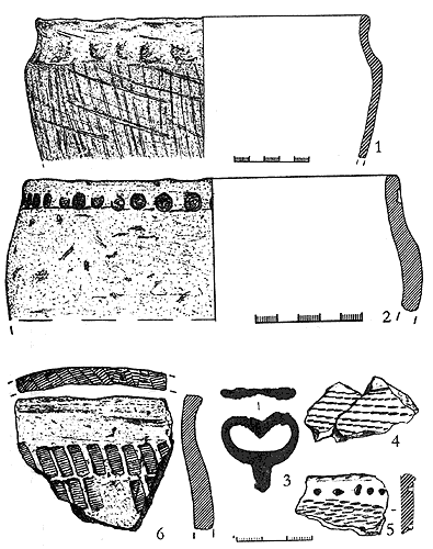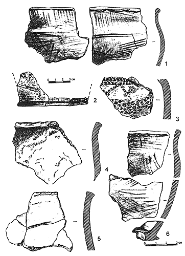Керамика: 1, 6 — штрихованная; 2, 3 — сетчатая; 4, 5 — гладкостенная