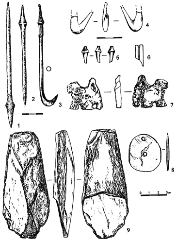 Обнаруженные многочисленные наконечники стрел листовидной формы связаны с охотничьей деятельностью, а их небольшие размеры говорят о том, что по-прежнему, как и в мезолите, главным оружием охотников остаются лук и стрелы (рис. 6: 3 — 8).