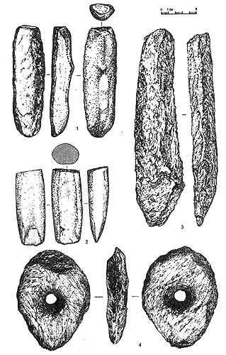 Рис. 5. Поселение Боровиково. Неолит. Орудия из сланца 1,2- топоры; 3 - пешня; 4 – мотыга
