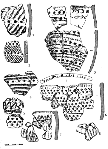6 — ямочно-гребенчатая (1, 3 — 8 — Боровикова; 2 - Машковские Горы; 7 — 8 — жилище)