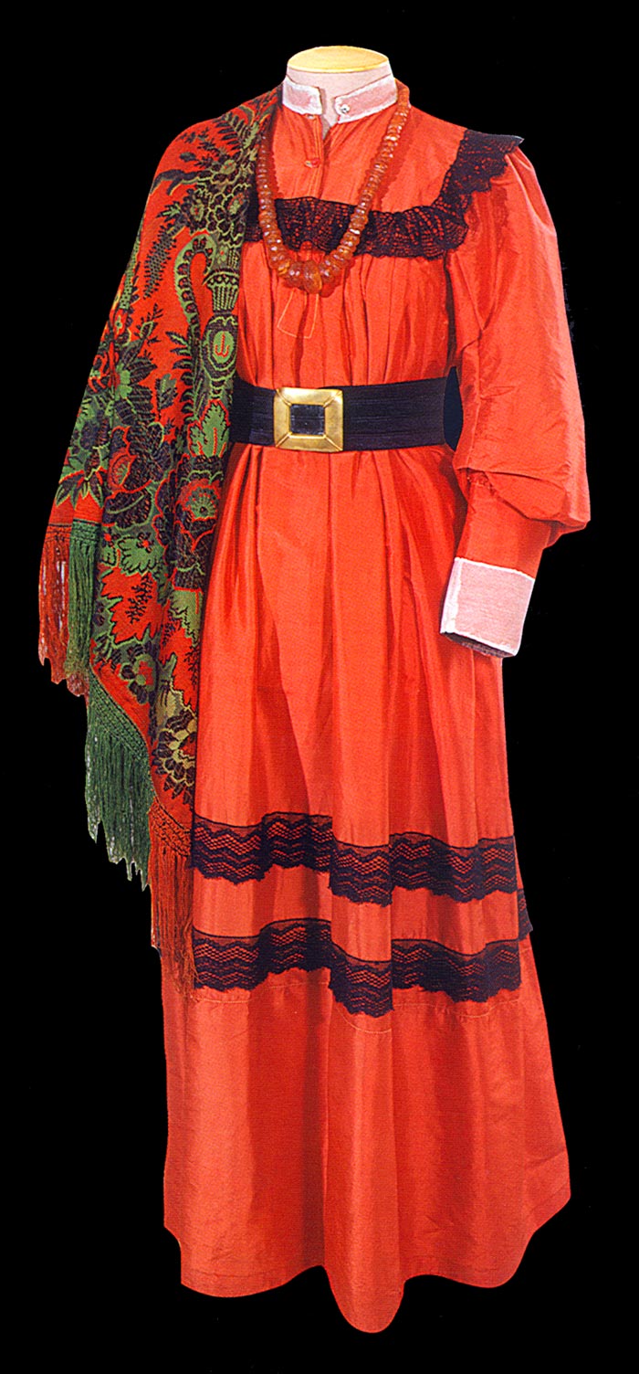 Прямое, на кокетке, сшито из шелковой тафты. Воротник-стойка, по центру груди — прямой разрез, застежка на металлические кнопки. Рукава втачные, длинные, пышные, с высокими манжетами. Воротник и концы рукавов украшены белой кружевной хлопчатобумажной тканью. Фигурная линия кокетки подчеркнута черным полушерстяным кружевом, две полосы такого же кружева пришиты на подоле. Подкладка из серой хлопчатобумажной ткани.