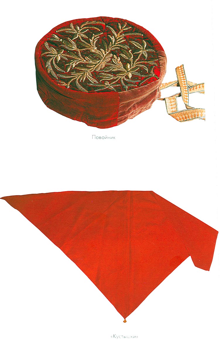 Женский головной убор в виде шапочки с круглым донцем и узким очельем. Донце из темно-вишневого бархата, украшено золотым шитьем в прикреп по карте (позолоченное пряденое серебро, бить, металлические блестки). Узор растительный в виде цветущей ветки. Очелье (околыш) из темного бархата. На затылке пришиты две завязки из узкой хлопчатобумажной тесьмы. Подкладка из светлой хлопчатобумажной ткани.