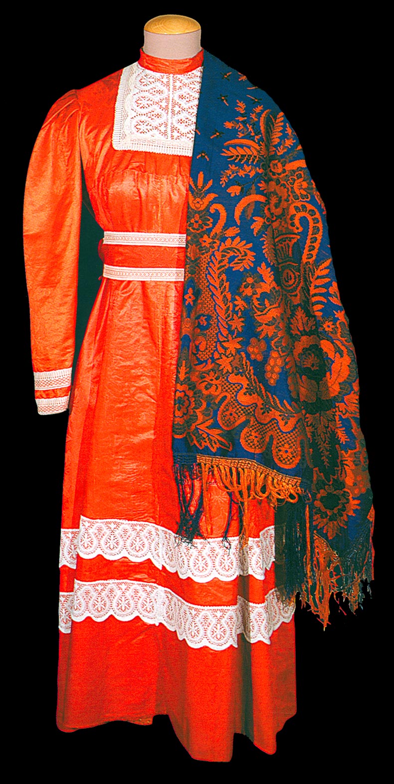 Основу костюма составляет ярко-красное платье, линия талии которого подчеркнута широким поясом (пояс-новодел, сшит из шелковой ткани красного цвета и украшен фабричным кружевом, реконструкция по аналогиям). Дополнением является шелковая шаль с кистями (местное название — «рипсовая»), которую накидывали на плечи. Завершал наряд парчовый повойник с платком-«кустышками».