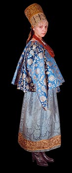 Короткая зимняя верхняя женская одежда. Косоклиная, распашная. Сшита из полушелковой ткани — парчи голубого цвета с золотисто-бежевыми вьющимися ветками с бутонами и цветами. Застежка в виде металлических крючков и петель, рукава длинные, утеплены ватином. Подкладка из голубой хлопчатобумажной, ткани. Меховой воротник и меховая подкладка утрачены.