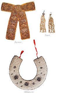 Шейное девичье украшение в виде подковообразного воротничка. Выполнен из льняного холста, украшен жемчугом и бисером в технике саженья по бели (поверх настила из белых толстых льняных ниток) и пятью декоративными розетками из цветных стекол в металлических оправах. Завязки из хлопчатобумажной тесьмы.