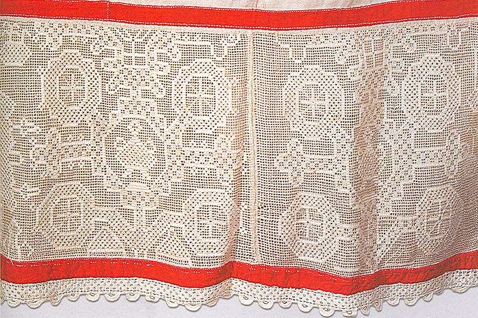 Составная, сшита из двух частей. Верхняя часть («рукава») — из белой хлопчатобумажной ткани. На кокетке, без воротника, по центру — прямой разрез, оформленный прямой планкой. Рукава длиною до локтя, широкие, со слитными попиками, внизу собраны в сборку, по краям — неширокое кружево, связанное крючком. Под мышками вшиты квадратные вставки-ластовицы. Нижняя часть рубахи (стан) сшита из четырех полос грубого льняного полотна. Пришивной подол украшен вышивкой «строчка» по разряженной ткани в виде крупных крестообразных геометрических фигур, окружающих стилизованную человеческую фигурку. Сверху и снизу подол обшит неширокими полосками кумача. Нижний край украшен белым кружевом.