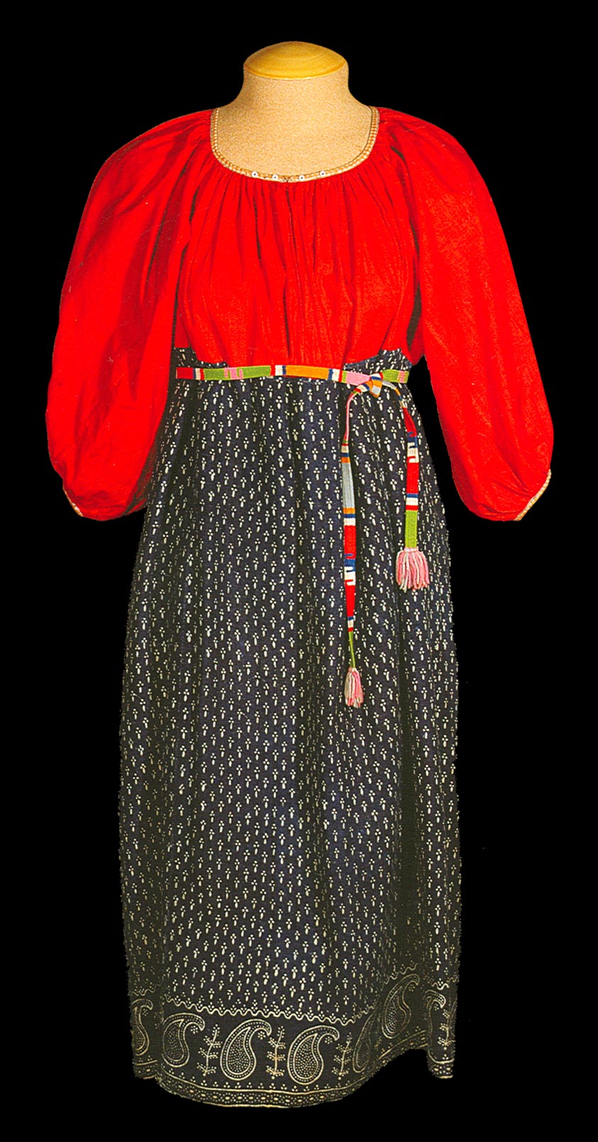 Составная, сшита из двух частей. Верхняя часть («рукава») — из красного кумача. Вырез горловины кареобразный, собран в мелкие защипы и окантован хлопчатобумажной тесьмой. Рукава до локтей, широкие, со слитными поликами, внизу собраны в сборку и обшиты тесьмой. Под мышками вшиты квадратные вставки-ластовицы. Нижняя часть (стан), сшита из четырех полос домотканого набивного плотна. Узор набойки геометрический, из белых фигур на темно-синем фоне. Подол завершает кайма, украшенная орнаментом в виде овальных геометрических фигур и стилизованных «веточек».