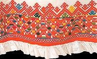 Прямой, на длинных, узких пришивных лямках. Сшит вручную из пяти полос красного кумача, вверху собран в мелкую сборку. Лямки и верхний край сарафана окантованы синей тканью. Подол украшен узором в виде стилизованных цветущих растений, вышитым цветными шерстяными нитками в технике тамбурного шва.