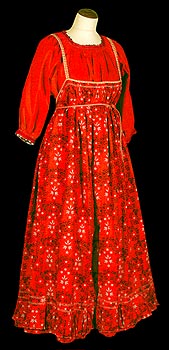 Прямой, на длинных, узких пришивных лямках. Сшит из пяти полос хлопчатобумажной ткани красного цвета с мелким черно-белым цветочным узором. Верхний край собран в мелкие складки-защипы. Лямки и верхний край сарафана обшиты пестрой тесьмой. Подол украшен оборкой с крупными складками. С изнанки подшит серой хлопчатобумажной тканью.