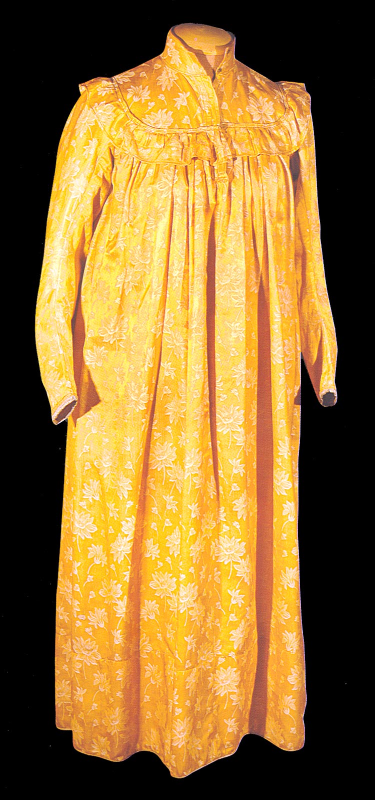 Прямое, на кокетке. Сшито из ярко-желтой полушелковой ткани — атласа. Воротник в виде невысокой стойки. По центру груди — прямой разрез, застежка на металлические кнопки, петли и крючки. Кокетка украшена оборкой. Рукава длинные, втачные, широкие вверху и зауженные книзу. Подкладка из ситца.