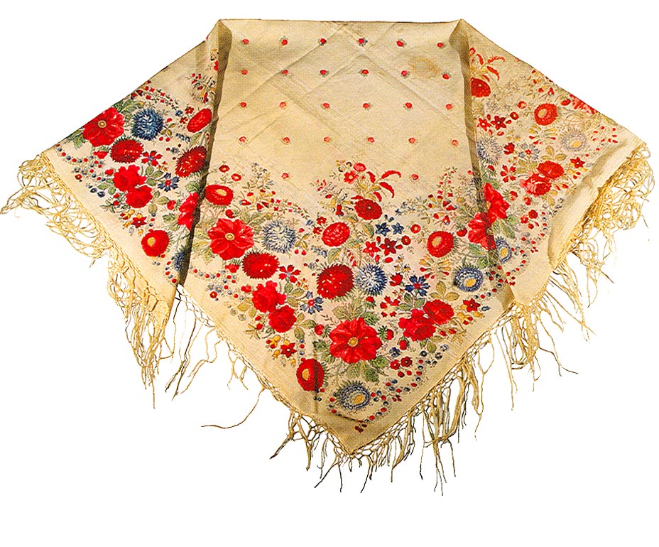 Из тонкой шерстяной ткани. На светлом фоне многоцветный узор: мелкие цветочки — в среднике и цветущие бутоны на вьющихся ветках — на кайме. По краям — кисти.