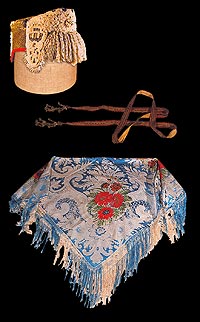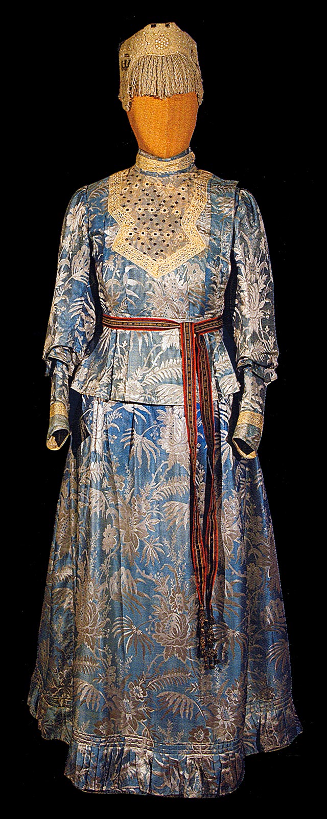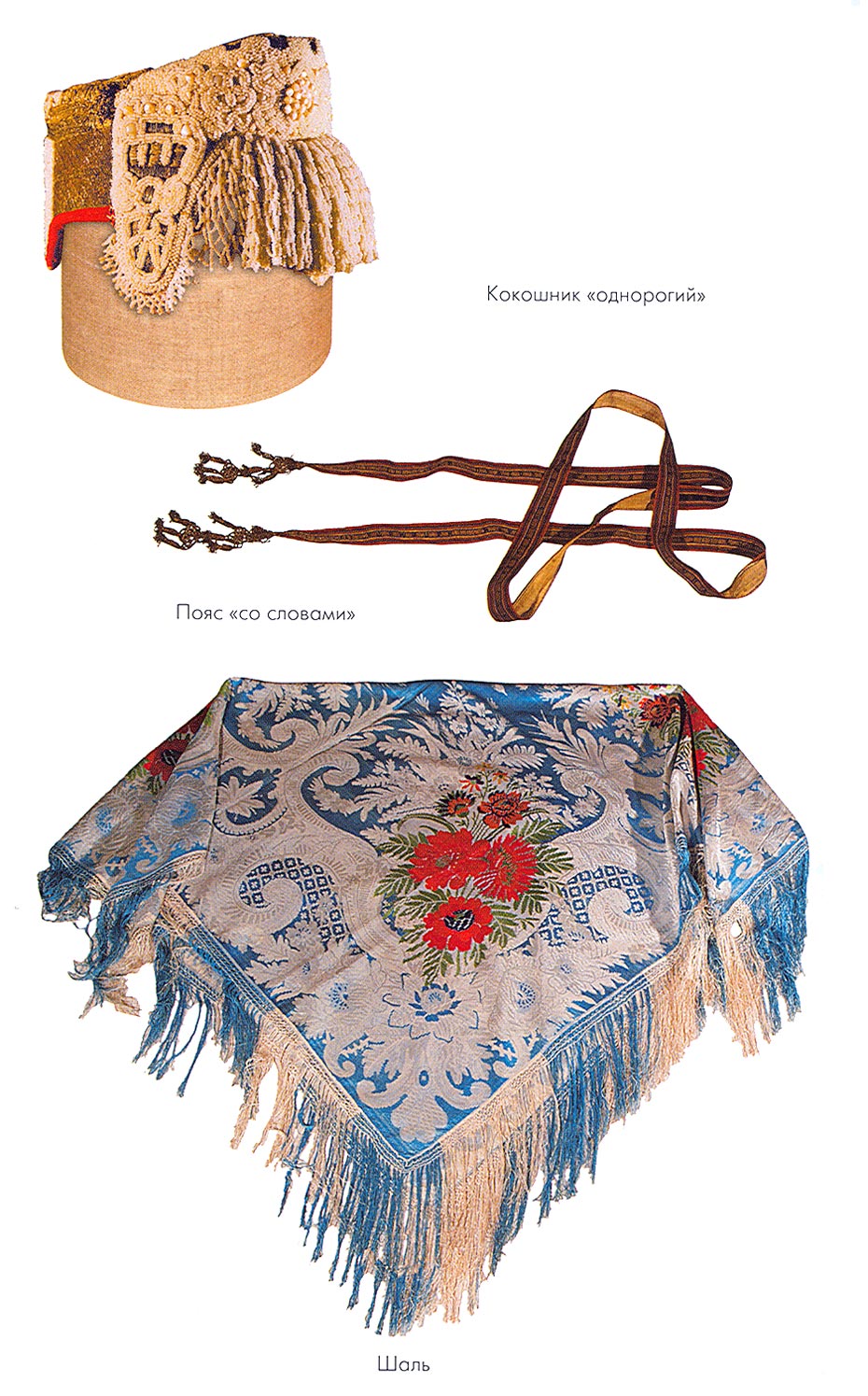 Состоит из шелкового костюма-«парочки», пояса, кокошника и шелковой шали.