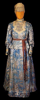 Состоит из кофты и юбки, сшитых из шелковой жаккардовой ткани голубого цвета.