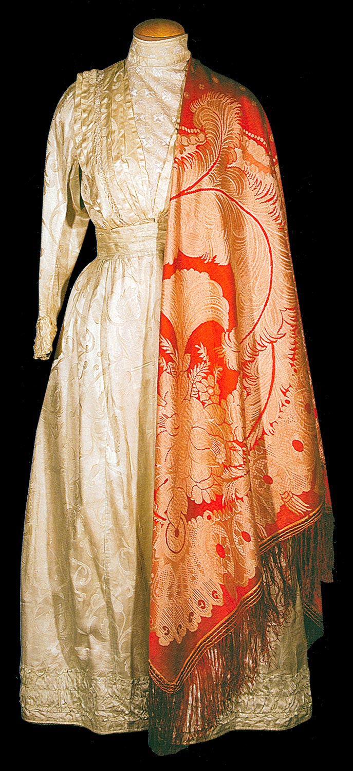 Состоит из шелкового костюма-«пары». Дополняет наряд шелковая шаль.
