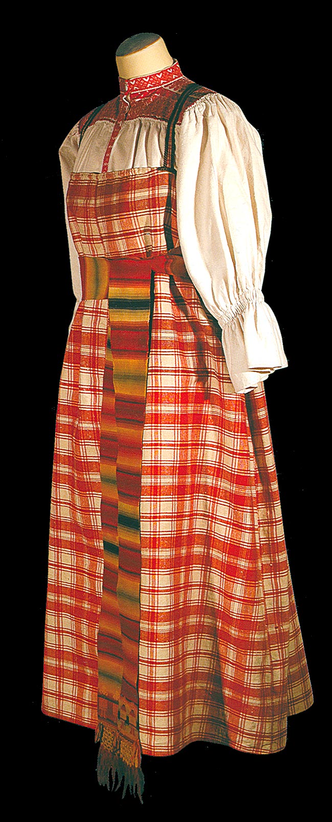 Прямой, на узких пришивных лямках. Сшит из пяти прямых полос домотканой пестряди в крупную красно-белую клетку. Спереди вверху собран на шнурок, который продернут в узкую обшивку («опушецку»), сзади мелкие сборки подшиты под планку из красного кумача с узором, вышитым крестом. Подол подшит льняным холстом.
