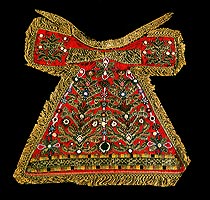 Женское нагрудное украшение, сшитое из малинового штофа на подкладке из льняного полотна. Украшено золотным шитьем, цветными стеклами в металлических оправах, бисером и половинчатым жемчугом. Узор в виде цветущих растений. По краям обшит мишурной тесьмой с бахромой. Вверху — завязка в виде узкой полоски.