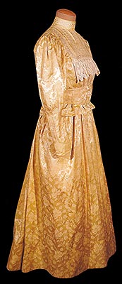 Кофта прямая, спереди — на прямой кокетке, украшенной кружевом. Внизу собрана в складки, на линии талии пришита небольшая планка. Воротник в виде стойки, застежка на мелкие перламутровые пуговицы и прорезные петли — с левой стороны. Рукава втачные, длинные, двухшовные, ниже локтя собраны в защипы. Подкладка из светлой хлопчатобумажной ткани.