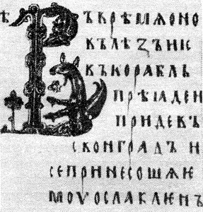 | "Остромирово евангилие", буквица | "Остромирово евангилие", фрагмент рукописи |