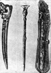 | Пропись грамоты с изображением цифр от 1 до 40000 | Орудия письма на бересте. Слева - костяное, в центре - металлическое "писало", справа - кожаный чехол на них |