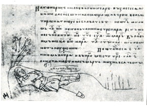 | "Выходные данные " Геннадиевской библии | "Делатель трудился" Рисунок на листе Типографического устава (XIII век) |