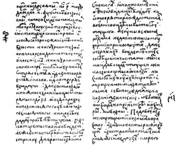 Для характеристики внешнего облика рукописей приведем описание академика Ф. И. Буслаева, посвященное псалтыри второй половины XV века: «Перелистывая драгоценную рукопись, мы любовались неожиданными переходами из одного почерка в другой, от одного стиля в украшениях к другому, и с интересом отгадывания загадок или шарад увлекались в распутывании перепутанных нитей хитросплетенного письма, добираясь в нем до смысла отдельных букв и целых речей». Говоря далее о работе писца, Буслаев замечает: «То он вводит строки из длинных голенастых заглавных букв, которые, как великаны, поднимаются из приземистого строя обыкновенных строчных букв, то расширяет их не в меру, так что они теряют характер кирилловского письма, получая стиль письма арабского или какого другого восточного. То он пишет самым тонким мелким шрифтом, замаскировывая славянское письмо крючковатою скорописью греческого...»