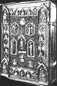 В начале XV века при Троице-Сергиевой лавре действовала специальная мастерская - книгописная палата. Книги украшались заставками, золотыми и киноварными буквами, изящными миниатюрами. Переплеты - тоже подлинное произведение искусства. Например: «Евангелие в десть писменое, на бумаге, поволочено бархатом рытым, цка верхняя серебряна, чеканная, золочена, а на ней четыре камени, два яхонта лазоревы, да кора яхонтовая червчата, да изумруд в гнездах... а застежки на червчатом бархате низаны жемчугом...»